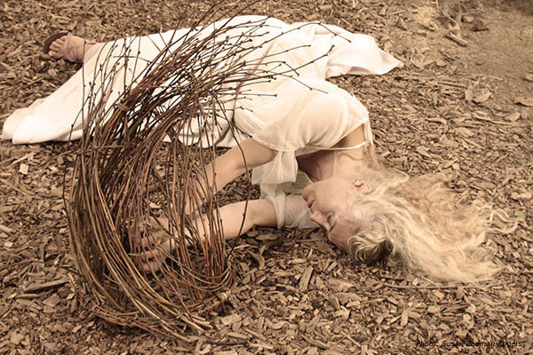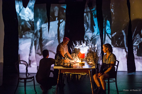 The stage is framed with rough, burlap-mesh covered cutouts of trees, and tree silhouettes as a backdrop. But everything hides a secret and a potential for transformation - trees contain drawers and cupboards; Enid emerges from a drawer in a piece of furniture that mutates from a burly kitchen table to a girl's delicate bed - and just when you think all the tricks have been played out, the final scene completely transforms the space yet again.