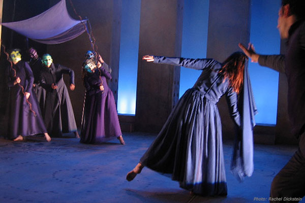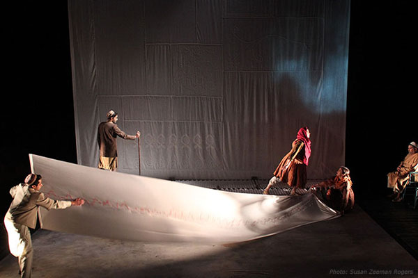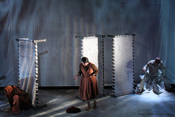 On Susan Zeeman Rogers sandstone-colored, henna-tattoo-decorated groundcloth three tall rectangular niches in the back wall, complimenting the Ohio Theatre s permanent columns, highlight our three heroines… Lovely images, such as the long saffron and orange silk banners wrapped around Kakkar like a giant flower with her glowing face at its center…